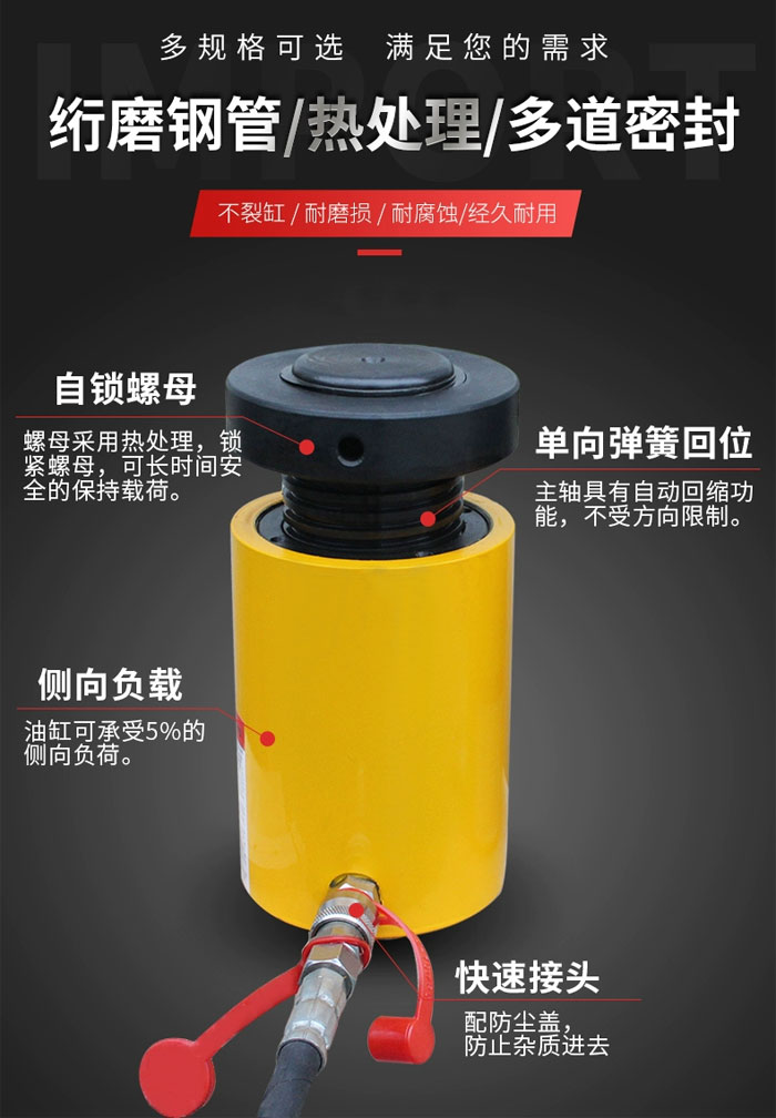 型號(hào) 承載能力T(KN) 行程mm 液壓缸有效面積cm2 液壓油溶量cm3 本體高度A mm 伸展高度Bmm 外徑Dmm 重量kg CLL-502 55(489) 50 71.3 356.5 164 214 125 16 CLL-504 100 713 214 314 21 CLL-506 150 1069.5 264 414 26 CLL-508 200 1426 314 514 31 CLL-5010 250 1782.5 364 614 36 CLL-5012 300 2139 414 714 41 CLL-1002 100(889) 50 133.3 666.5 187 237 165 31 CLL-1004 100 1333 237 337 39 CLL-1006 150 1999.5 287 437 48 CLL-1008 200 2666 337 537 57 CLL-10010 250 3332.5 387 637 65 CLL-10012 300 3999 437 757 74 CLL-1502 150(1333) 50 198 990 209 259 205 53 CLL-1504 100 1980 259 359 66 CLL-1506 150 2970 309 459 78 CLL-1508 200 3960 359 559 92 CLL-15010 250 4950 409 659 105 CLL-15012 300 5940 459 759 118 CLL-2002 200(178) 50 266.5 1332.5 243 293 2 2 3 5 83 CLL-2006 150 3997.5 343 493 118 CLL-20010 250 6662.5 443 693 153 CLL-2502 280(2489) 50 366.4 1832 249 299 275 116 CLL-2506 150 5496 349 499 163 CLL-25010 250 9160 449 699 210 CLL-3002 350(3111) 50 457 2285 295 345 310 173 CLL-3006 150 6855 395 545 233 CLL-30010 250 11425 495 745 293 CLL-4002 430(3821) 50 559 2795 335 385 350 251 CLL-4006 150 8385 435 585 327 CLL-40010 250 13975 535 785 403 CLL-5002 565(5022) 50 730 3650 375 425 400 367 CLL-5006 150 10950 475 625 467 CLL-50010 250 18250 575 825 568 CLL-6002 660(5866) 50 857 4285 395 445 430 447 CLL-6006 150 12855 495 645 563 CLL-60010 250 21425 595 845 680 CLL-8002 880(5866) 50 1179 5895 455 505 505 711 CLL-8006 150 5895 555 705 871 CLL-80010 250 29475 655 905 1031 CLL-10002 1080(9600) 150 1465 7325 495 545 560 951 CLL-10006 50 21975 595 745 1143 CLL-100010 250 36625 695 945 1335 四、注意事項(xiàng)