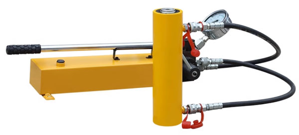 8、使用時(shí)先將手動(dòng)泵的快速接頭與頂對(duì)接,然后選好位置,將油泵上的放油螺釘旋緊,即可工作。欲使活塞桿下降,將手動(dòng)油泵手輪按逆時(shí)針?lè)较蛭⑽⑿?,油缸卸荷,活塞桿即逐漸下降。否則下降速度過(guò)快將產(chǎn)生危險(xiǎn)。